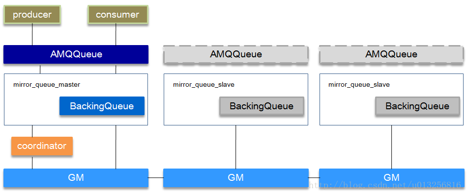镜像队列基本上就是一个特殊的BackingQueue,它内部包裹了一个普通的BackingQueue做本地消息持久化处理,在此基础上增加了将消息和ack复制到所有镜像的功能。所有对mirror_queue_master的操作,会通过可靠组播GM的方式同步到各slave节点。GM负责消息的广播,mirror_queue_slave负责回调处理,而master上的回调处理是由coordinator负责完成。mirror_queue_slave中包含了普通的BackingQueue进行消息的存储,master节点中BackingQueue包含在mirror_queue_master中由AMQQueue进行调用。